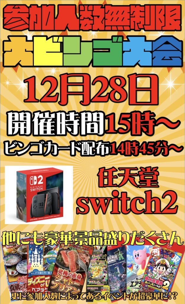 今年最後の大ビンゴ大会を開催!! 景品も超豪華!! Switch2がGET出来…