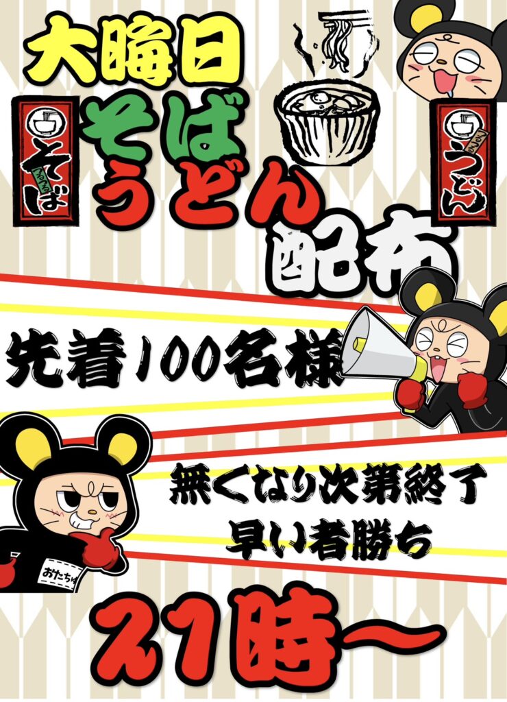 大晦日21時よりそばうどんを配布します。 お一人様1つまでどちらか好き…