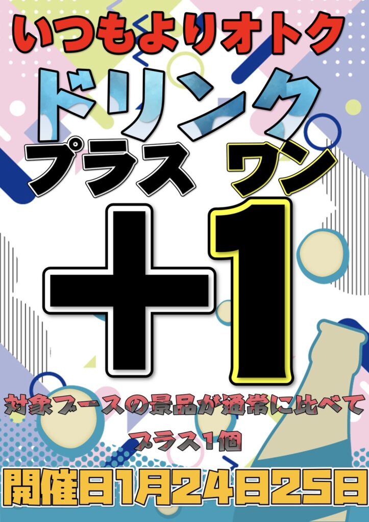 1月24日25日の2日間ドリンクプラスワンを開催します! 対象ブースのド…