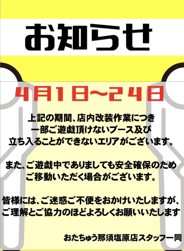 4月1日より改装作業を行います。 期間内は作業の状況により御遊戯頂け…