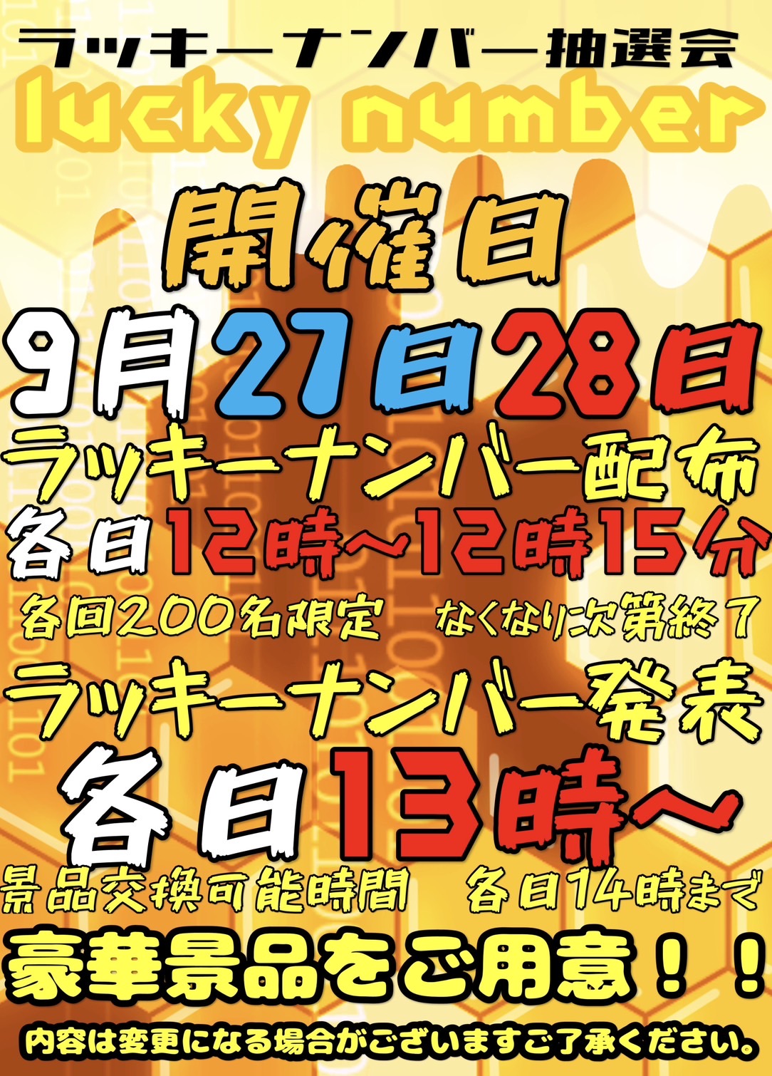 ★《9月27日・28日》ラッキーナンバー抽選会★ イベント 2025年9月27日 ★ラッキーナンバー抽選会★ ラッキーナンバー抽選会を開催12時から12時15分の間に配布限定200名無くなり次第終了!!