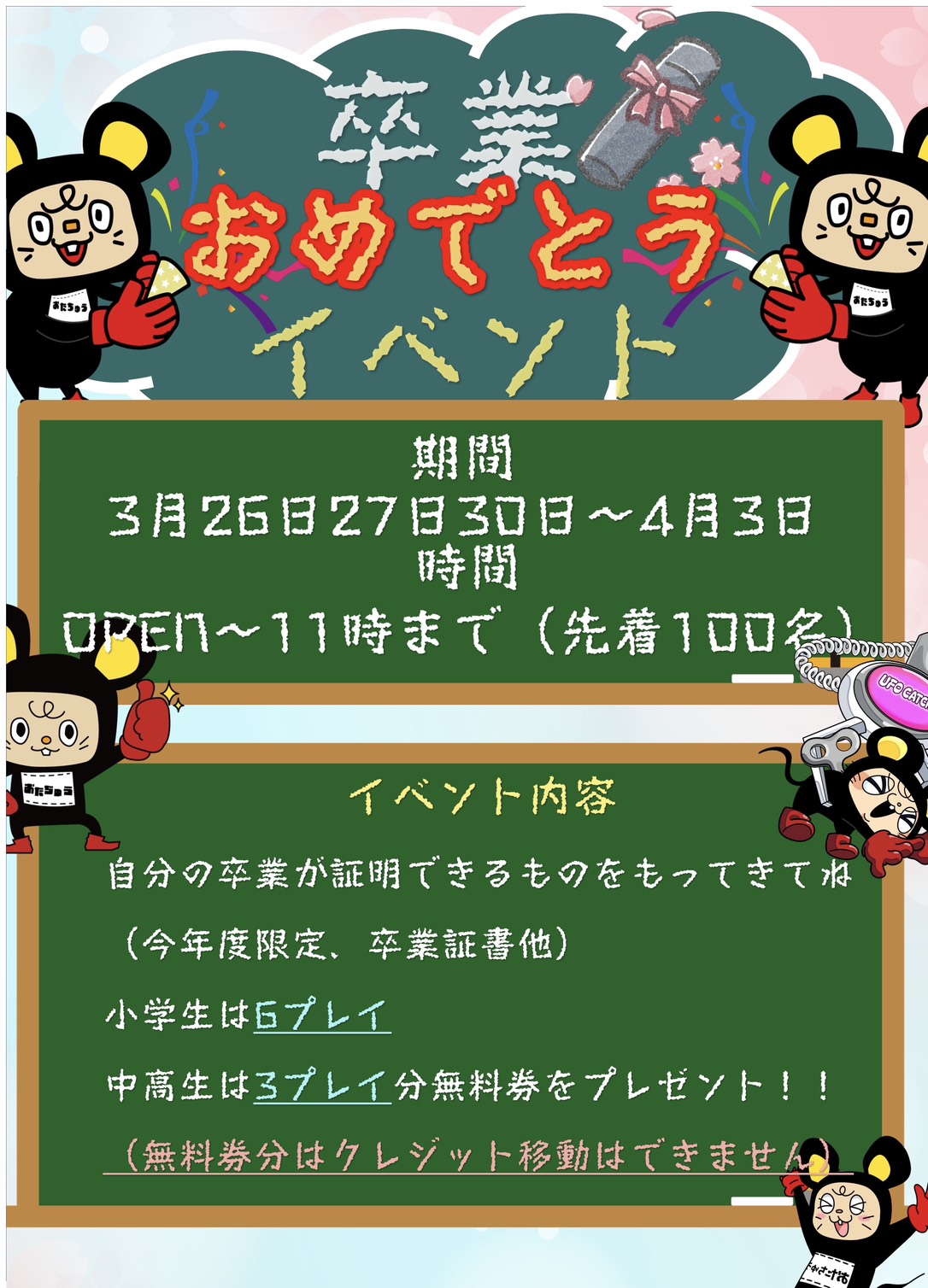卒業おめでとう!友達と一緒におたちゅうで思い出を作ろう! イベント 2026年3月22日 3月26日〜4月3日の平日限定 Openから11時まで100名様限定 クレーンゲーム無料回数券をプレゼント! 家族や友だちとおたちゅうへGO! 皆様のご来店をお待ちしております